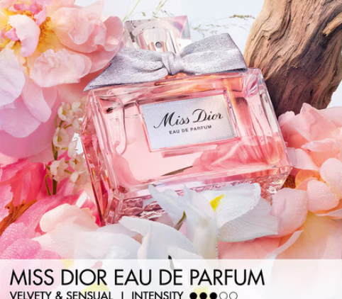 - Miss Dior Eau de Parfum, 100 ml. Miss Dior Eau de Parfum is an olfactory "millefiori", a scent that evokes a bouquet of multicolored flowers. A heart note of centifolia rose is heightened with a fresh lily-of-the-valley and a peony accord, enveloped in softwood touches.