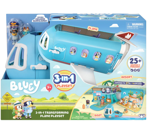 Go up, up and away on the ultimate holiday with the Bluey 3-in-1 Transforming Plane Playset! This incredible playset easily transforms from a plane into a resort and a boat. It comes with two exclusive figures - Bluey in her pilot's hat and sunglasses, and Bingo with her sunnies on - and 15 play pieces so you can play out the best vacation ever!