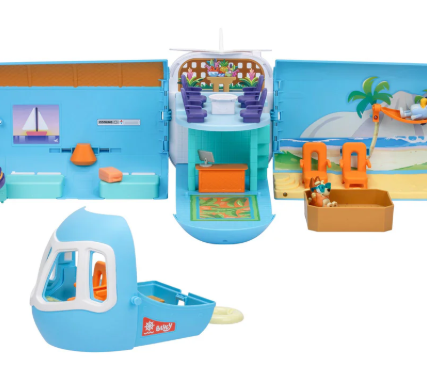 Open up the body of the plane to reveal a huge 27"/ 70cm wide playset with two levels and plenty of areas to explore, like a hotel lobby, hotel room and a beach. The cockpit of the plane transforms into boat for more adventures! The whole playset comes to life with over 25 sounds and phrases from the show, and includes an "Aussie Passport" and sticker sheet to decorate with.