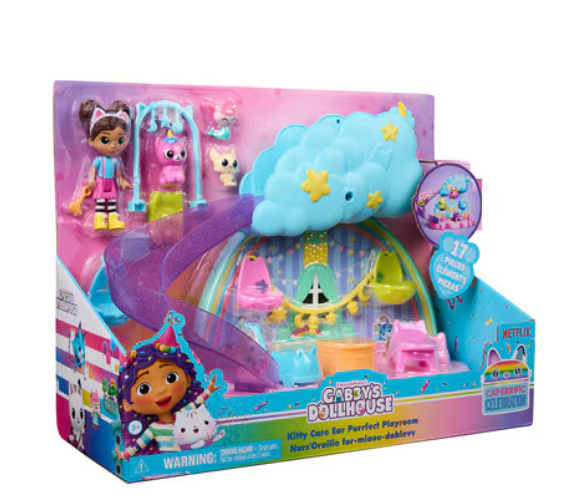 Create exciting babysitting adventures with Gabby and the baby kitties, in the Kitty Care Ear Purrfect Playroom! This 17-piece playset features a Gabby girl figure, 3 baby kitties and a nursery playset that's full of surprises!