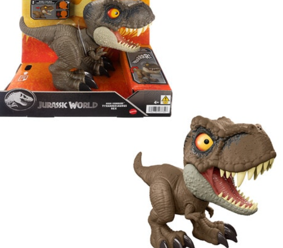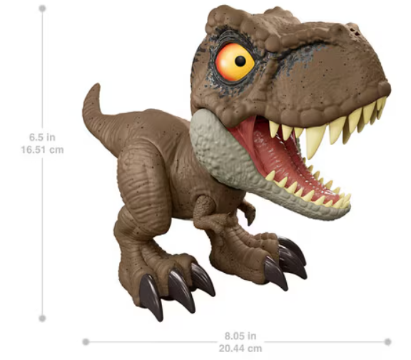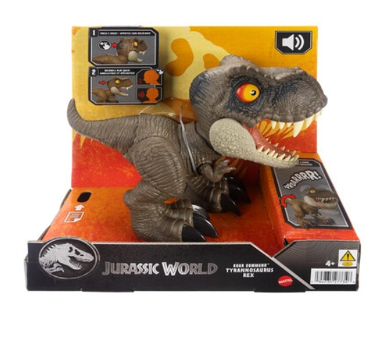 This Tyrannosaurus rex stylized dinosaur brings a whole new way for fans to interact with their wild Jurassic World favorite. This T. rex figure has a special feature that lets fans record phrases that get translated into "dinosaur speak!" Just press and hold the button on the back of the head, then speak to record. Release the button to hear it come out as "dinosaur talk!" Then twist the tail on this 8-inch long figure to see a multi-direction attack and hear dinosaur roars! Makes a great gift for dinosaur fans ages 4 years and up. Just press and hold the button on the back of the T. rex's head and speak clearly. Then let go and hear those words turned into Dino-speak! This toy provides fun dinosaur talk for all. Twisting attack & roar! Twist the tail to activate a multi-direction attack and hear Jurassic World roars. Holdable! The stylized figure is about 6.5 inches tall and 8 inches long, easy to hold and manipulate, even for young fans as young as 4 years old. Wrap it up! Makes a great gift for any dinosaur lover, especially Jurassic World fans. Jurassic World Roar Command Tyrannosaurus Rex Dinosaur Figure Toy, Records, Plays & Roars, T. Rex Includes 1 Jurassic World Roar Command Tyrannosaurus Rex dinosaur toy. WARNING: Button Cell Batteries are Hazardous (new or used). Keep away from children. Button Cell Batteries can cause severe or fatal injuries in 2 hours or less if they are swallowed or placed inside any part of the body. If you suspect your child has swallowed or inserted a button cell battery, call the 24-hour Poisons Information Centre New Zealand at 0800 764 766 or contact your country's emergency department.