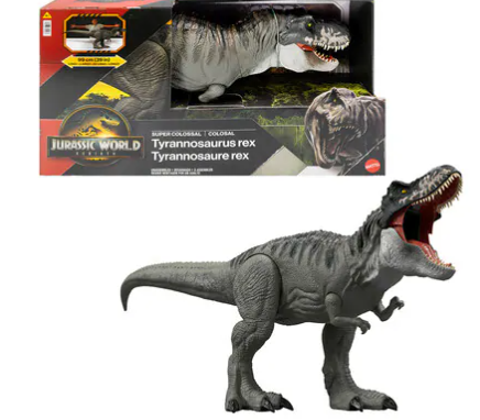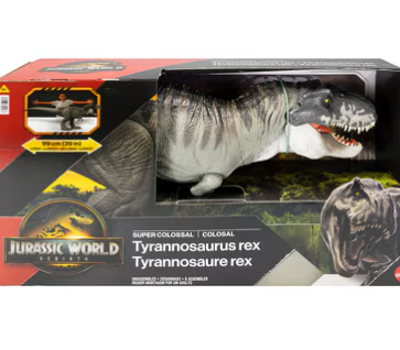 This Super Colossal Tyrannosaurus rex dinosaur figure brings the excitement of Jurassic World Rebirth home with its huge size and distinctive look. At 39 inches long, with movable joints and content-accurate design, this T. rex action figure is ready for battle moves and poses. It can also "swallow" mini dinos for realistic movie re-enactments! Just unlatch the stomach to "release" the dinos. Makes a great gift for big dinosaur fans ages 4 years and up. Jurassic World Rebirth Super Colossal Tyrannosaurus Rex Action Figure, T-Rex Dinosaur Movie Toy #Includes 1 Jurassic World Super Colossal Tyrannosaurus rex dinosaur action figure.
