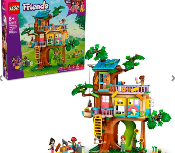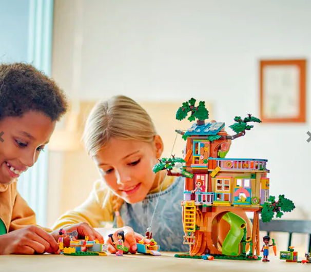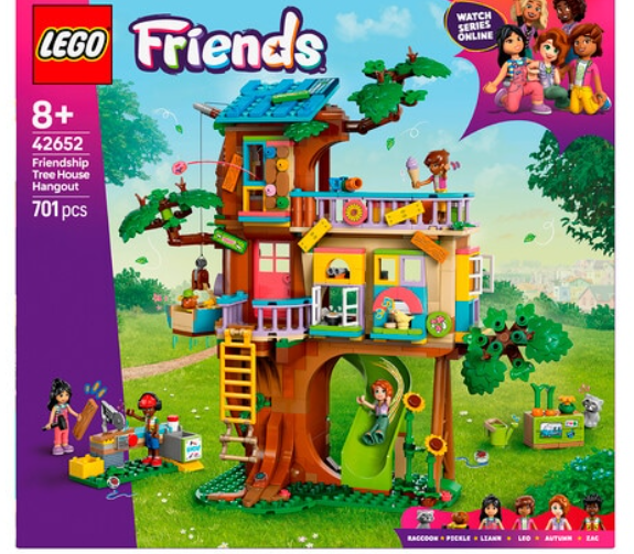 See imaginations grow with this LEGO® Friends Friendship Tree House Hangout (42652) building kit. This detailed kids' set lets girls and boys aged 8 and up create their own friendship adventures. It comes with 4 LEGO Friends minidolls, a dog figure and a raccoon figure, plus a buildable workbench with tools. This set is packed with fun stories, as the characters Liann, Autumn, Leo and Zac enjoy time together in the tree house they have built. There are spaces for playing, cooking and sleeping, plus a veggie patch with carrots to pick. Sweet details include the elevator that Pickle the dog uses and the raccoon's secret hideaway. Boost creativity as kids use the special tiles to add their own finishing touches to the tree house design. The window details are also interchangeable, so young builders can customize their model even further. Check out other social development toys in the LEGO Friends universe, where there are lots more stories to uncover (sets sold separately).