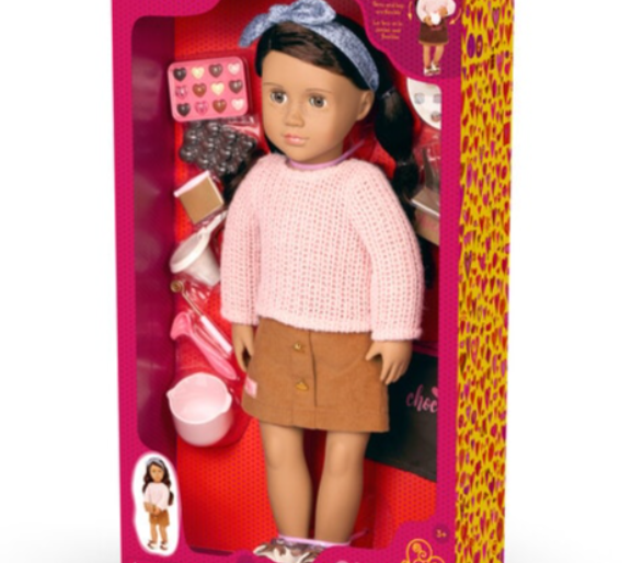 18-inch (45cm) Baker Doll: Bake up sweet, chocolatey fun with Our Generation 18-inch doll Coco! Detailed Features: Coco has lifelike brown eyes that open and close, cute freckles, and long brown hair to style. Posable Arms & Legs: Huggable soft body; knees and elbows bend to play out fun poses and bake delicious desserts with the chocolate-making accessories! Includes: Doll, outfit, headband, apron, a pair of undies, shoes, swirling tool, drizzle spoon, candy funnel, mixing bowl, chocolate scraper, 12 heart chocolates, box, chocolate mold with insert, and a sticker sheet that smells like yummy chocolate. Mix & Match: Clothing has easy-open closures to quickly put on and remove as kids explore storytelling and self-expression. Compatible with most 18-inch dolls, doll clothes, and accessories. Recommended Age: Our Generation dolls make a great gift for kids ages 3 years old and up (small parts), encouraging them to create their own unique stories.