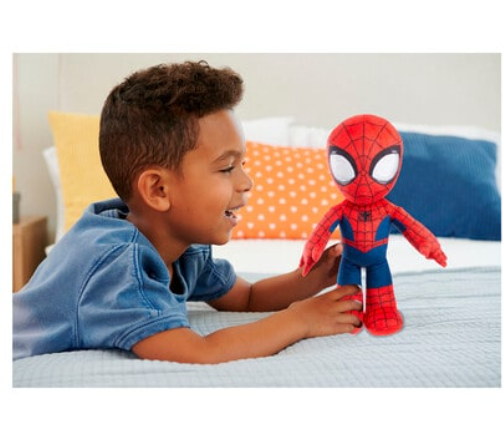 Enter the Marvel Universe with this Spider-Man Plush Talkers character figure. Featuring a signature look with printed details, the 11.75-inch soft doll has 10 iconic sounds and phrases from across his story - just push the figure's chest to activate! Bringing the superhero to life, this Plush Talkers toy makes a great gift for Marvel fans ages 3 years old and up.