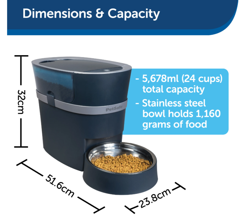 Bring peace of mind to meal time with the PetSafe® Smart Feed Automatic Pet Feeder. Designed by pet parents, you can schedule, monitor and adjust your pet’s feeding schedule remotely with the user-friendly smartphone app. Download the free app to your phone or mobile device, connect the feeder to your home’s Wi-Fi and enjoy convenient meal scheduling from anywhere. The feeder holds 24 cups (5,678 ml) of dry or semi-moist food. The unique design of the Smart Feed’s food conveyor dispenses most shapes and sizes of dry and semi-moist food while helping to prevent jams. Meals can be scheduled for up to 12 times daily in sizes from 1/8 cup (29 ml) to 4 cups (946 ml) per meal. The optional Slow Feed setting dispenses meals in small amounts over 15 minutes for pets who tend to eat too quickly. The Feed Now option lets you serve a meal on demand any time from the app or with the push of a pet-proof button on the feeder. The included stainless steel bowl with a removable holder prevents your pet from tipping or moving the bowl. These components and the upper compartment where food is added are all dishwasher safe, top rack only. The automatic pet feeder includes an AC power adapter and has a backup battery option using 4 D batteries (not included). To connect your PetSafe™ Smart Feed Automatic Pet Feeder to your smartphone app, a 2.4GHz (802.11b/g/n) wireless router is required. Devices that work with the mobile app are iPhones or iPods with iOS 9.0 or later and compatible Android smartphones version 6.0 or later. One feeder can be controlled from multiple family members’ smartphones. Multiple feeders can also be controlled from one smartphone.