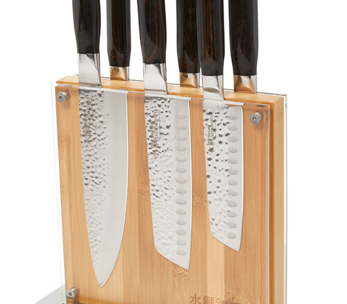You'll be slicing and dicing like the professionals with the Damishiro Shi knife block. The on-trend wood and glass knife block comes with 6 knives made of traditionally hammered Japanese steel, patterned to slice with ease and reduce drag.