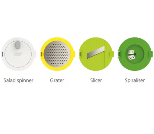 - Includes four interchangeable discs for different tasks: salad spinner, spiralizer, slicer and grater