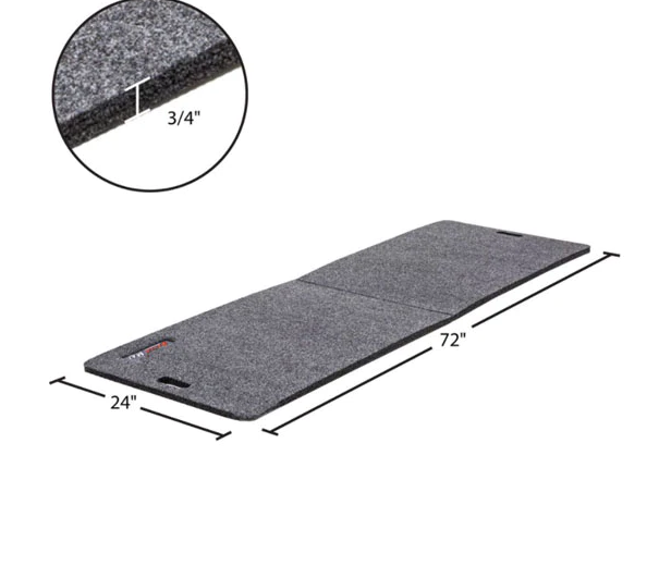 Measuring 1820mm x 60mm and 19mm thick it is big enough to lie on. For transport and storage, it can be folded in half and has cut-out handles. Protect your back, knees and maybe even your clothes any time you're on the ground.