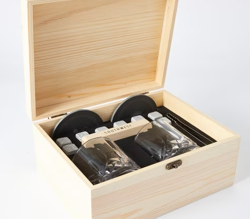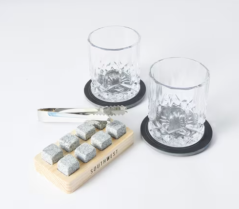 Set Includes: 2x 295ml Whisky Glasses, 8x Whisky Stones, 1x Wood Tray, 2x Slate Coasters, 1x 18/10 Stainless Steel Ice Tong, 2x Recipe Cards & Wooden Box.