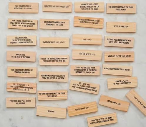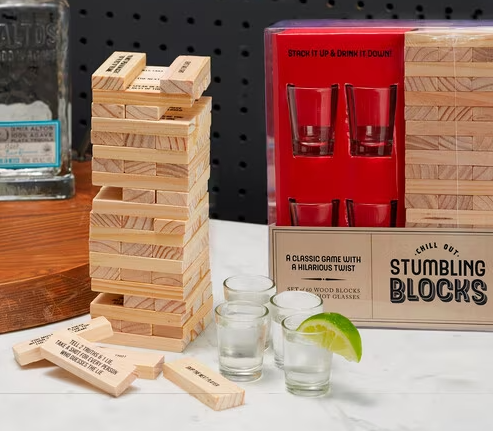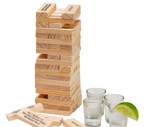 - Includes: 4 shot glasses 60 block pieces with assorted sayings.
