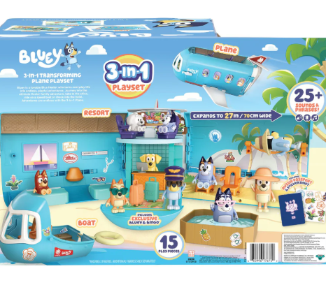 Go up, up and away on the ultimate holiday with the Bluey 3-in-1 Transforming Plane Playset! This incredible playset easily transforms from a plane into a resort and a boat. It comes with two exclusive figures - Bluey in her pilot's hat and sunglasses, and Bingo with her sunnies on - and 15 play pieces so you can play out the best vacation ever!