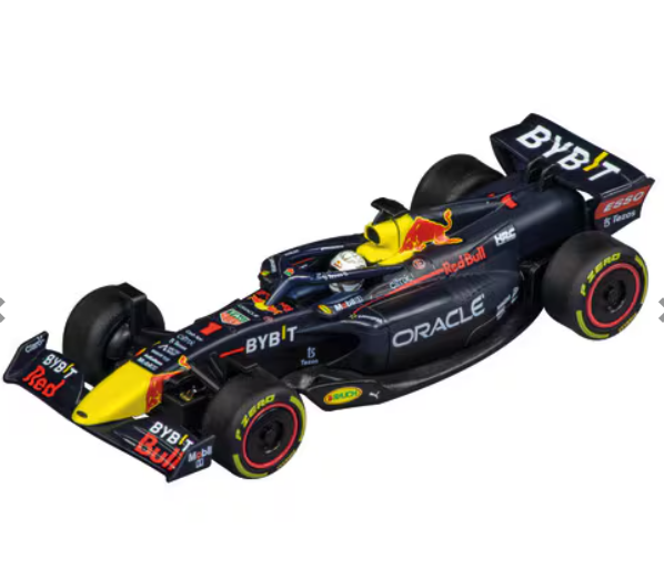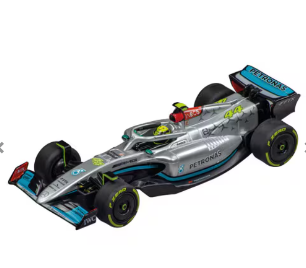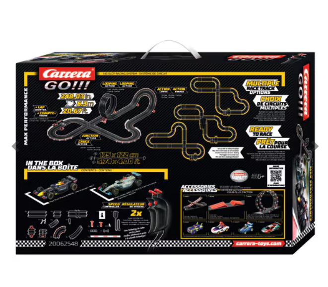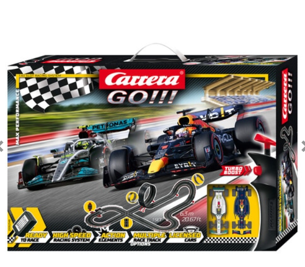 Formula 1 World Championship Rematch: Mercedes versus Red Bull Racing This is a small-scale battle re-enactment between the key rivals for the 2021 F1 world championship. The Carrera GO!!! 'Max Performance' set allows you and your friends to rerun the thrilling Formula 1 dogfights between Max Verstappen and Lewis Hamilton at any time. World championship racing fun Two hand-held controllers with a turbo button propel Mercedes-AMG F1 W13 E Performance 'Hamilton, No.44' and Red Bull Racing RB18 'Verstappen, No.1' down long straights and round bends at top speed. You'll need absolute handset precision to navigate the fly-over, loop and junction.