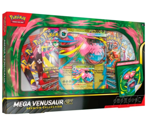 Solar-Powered Smackdowns with Mega Venusaur ex! Keep your Pokémon at full power with help from Mega Venusaur ex! Its Solar Transfer Ability lets you move Grass Energy among your Pokémon as you please, ensuring you're always ready to attack. In this collection, you get a playable foil promo card and an oversize lenticular promo card featuring Mega Venusaur ex, along with a tech sticker for decorating devices, binders, and notebooks. You'll find even more Pokémon inside a stack of Pokémon TCG booster packs. The Pokémon TCG: Mega Venusaur ex Premium Collection includes: 1 foil promo card featuring Mega Venusaur ex 1 oversize lenticular promo card featuring Mega Venusaur ex 1 tech sticker featuring Mega Venusaur 8 Pokémon TCG booster packs