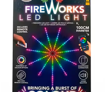 Transform your space with the dazzling Fireworks LED Light! Featuring 11 RGB light strips that mimic fireworks in full bloom, it offers 16 million colours, dynamic modes, and music sync for a vibrant, immersive experience. Easily controlled via app or the included remote, it's perfect for parties, holidays, and everyday decor.