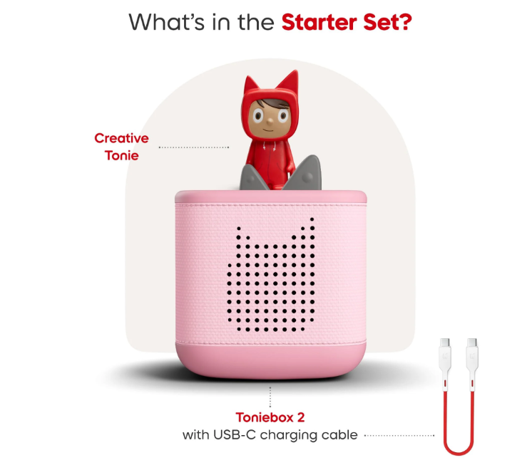 Listen, grow and play in a whole new way with Toniebox 2 and the Creative Tonie Rubie. This Starter Set includes the Creative Tonie Rubie with space for up to 90 minutes of custom audio, and a Cloud Pink Toniebox 2.