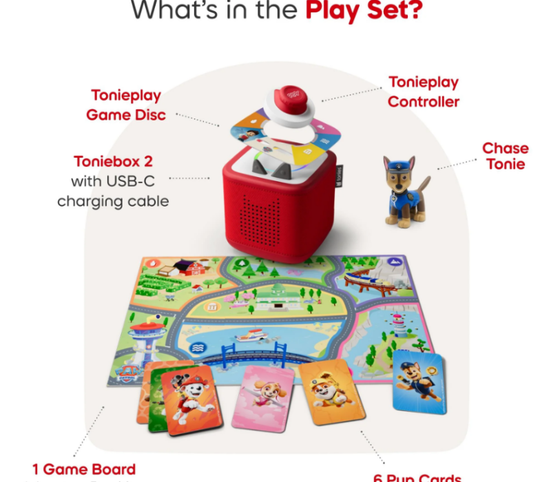 This Play Set includes a Toniebox 2, PAW Patrol Chase Tonie, PAW Patrol: Adventure Bay Rescue Heroes Tonieplay Game & Tonieplay Controller.