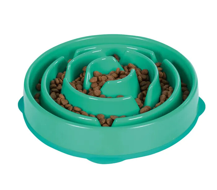 Dogs learn to "chase" their food through a maze of ridges and valleys. This in turn makes the meal last longer, reducing the risk for bloat, regurgitation and obesity. Another feature is the non-slip rubber base which holds the bowl in place. Available in various colours and designs.