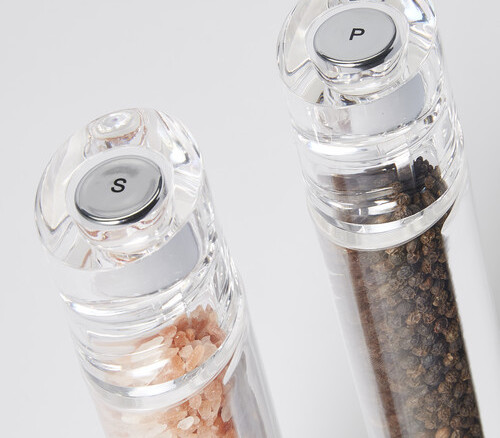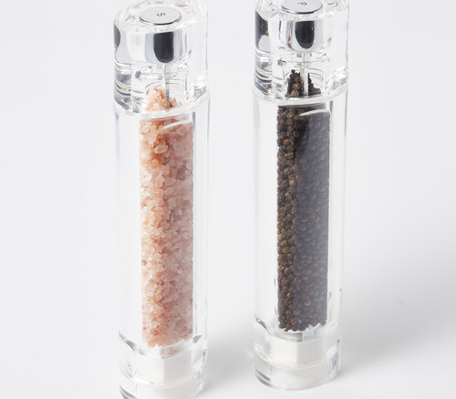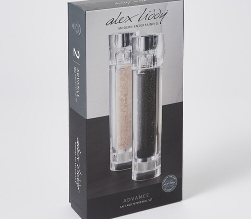 The Alex Liddy Advance Salt & Pepper Mill Set is crafted from clear acrylic with stainless steel features. The see-through design of the salt and pepper mills allows you to see how much seasoning you have left with only a glance.
