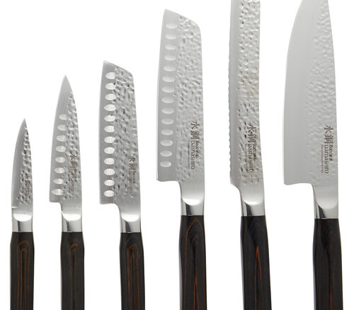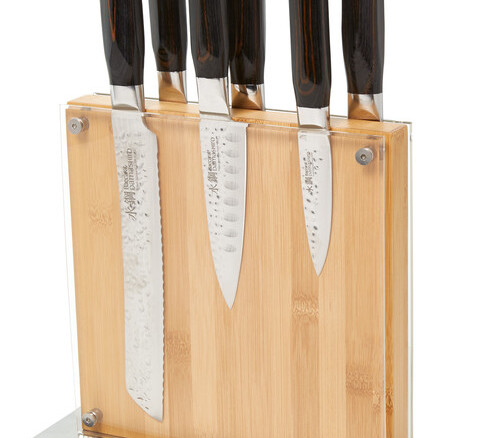You'll be slicing and dicing like the professionals with the Damishiro Shi knife block. The on-trend wood and glass knife block comes with 6 knives made of traditionally hammered Japanese steel, patterned to slice with ease and reduce drag.