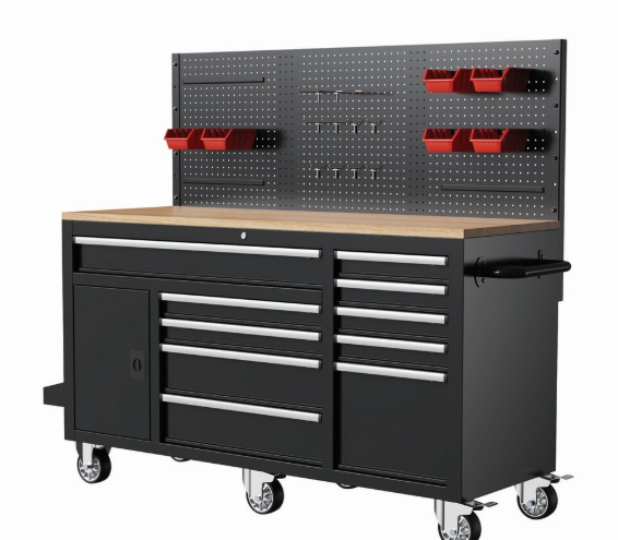 The heavy duty 62in roller tool cabinet comes with 10 drawers with 1 door and the steel pegboard which includes 12 hooks and 6 bins for tool organization. Some assembly required.
